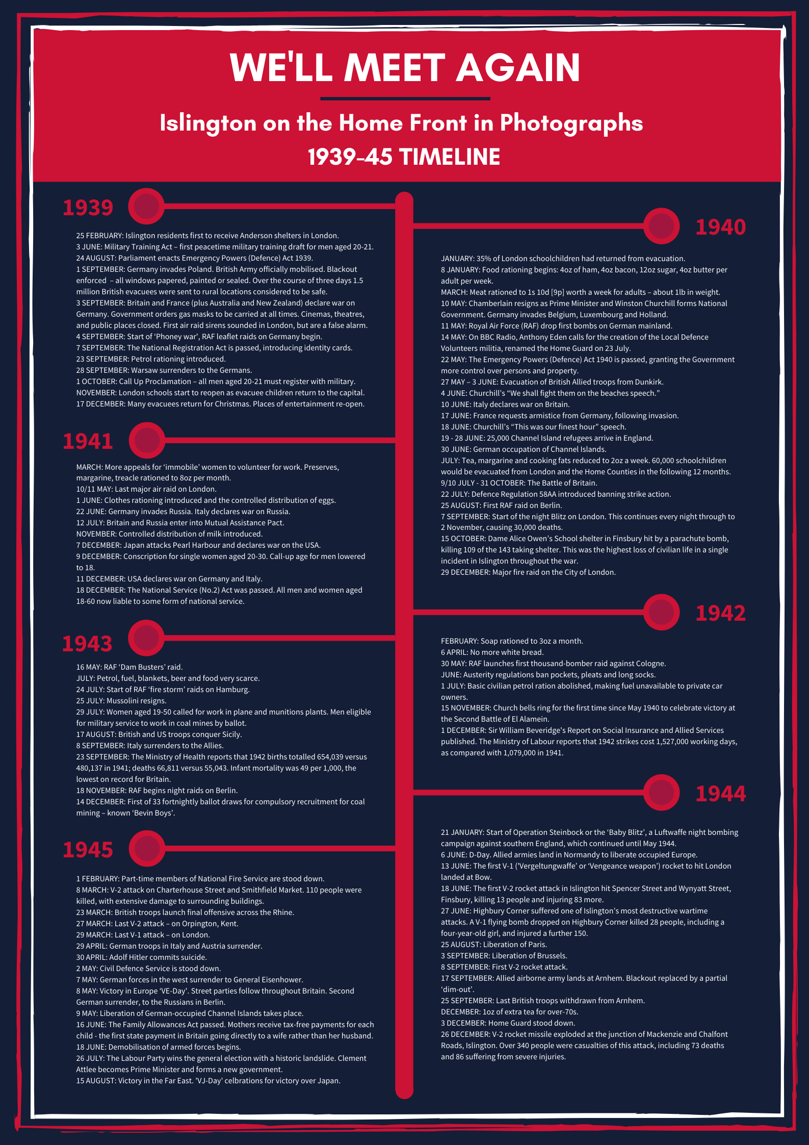 Upon the 75th anniversary of the end of the Second World War in Europe, Islington Museum presents a photographic exhibition to commemorate all who bravely endured life on the Home Front in Islington, Finsbury and beyond.