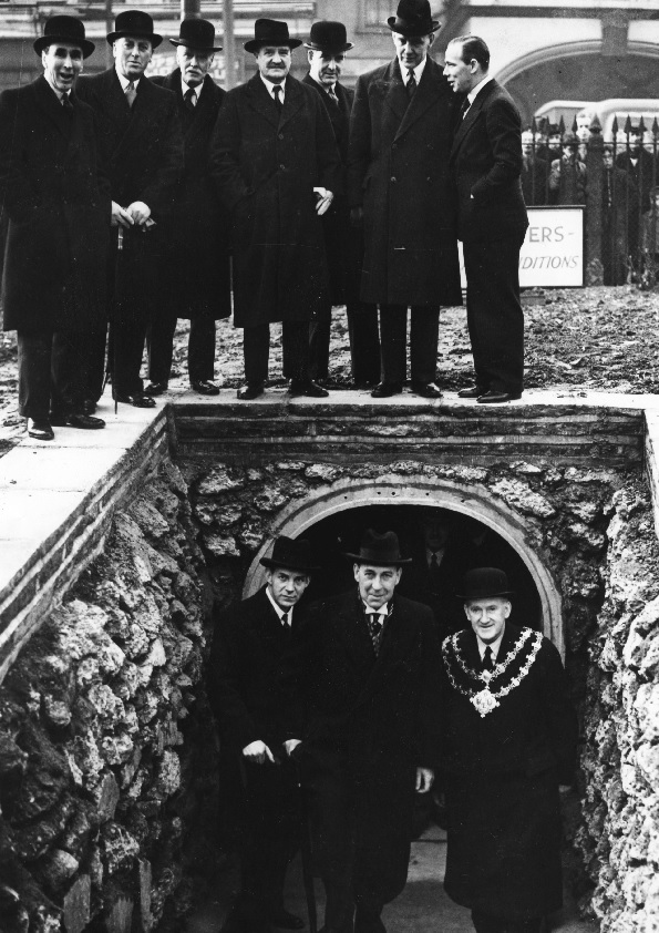 Sir John Anderson (centre), Minister for Civil Defence inspects new air-raid trenches on Islington Green. During the visit he formally handed over the trenches to Islington Mayor Douglas Jackson (right). Also present was Lord Wolmar (right), topped by members of Islington Council.