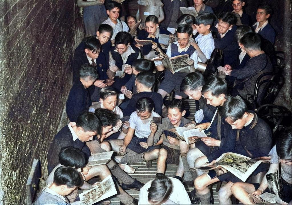 Pupils of Hugh Myddleton School in Corporation Row, Clerkenwell, reading comics and playing cards in the school shelter during an air-raid drill.