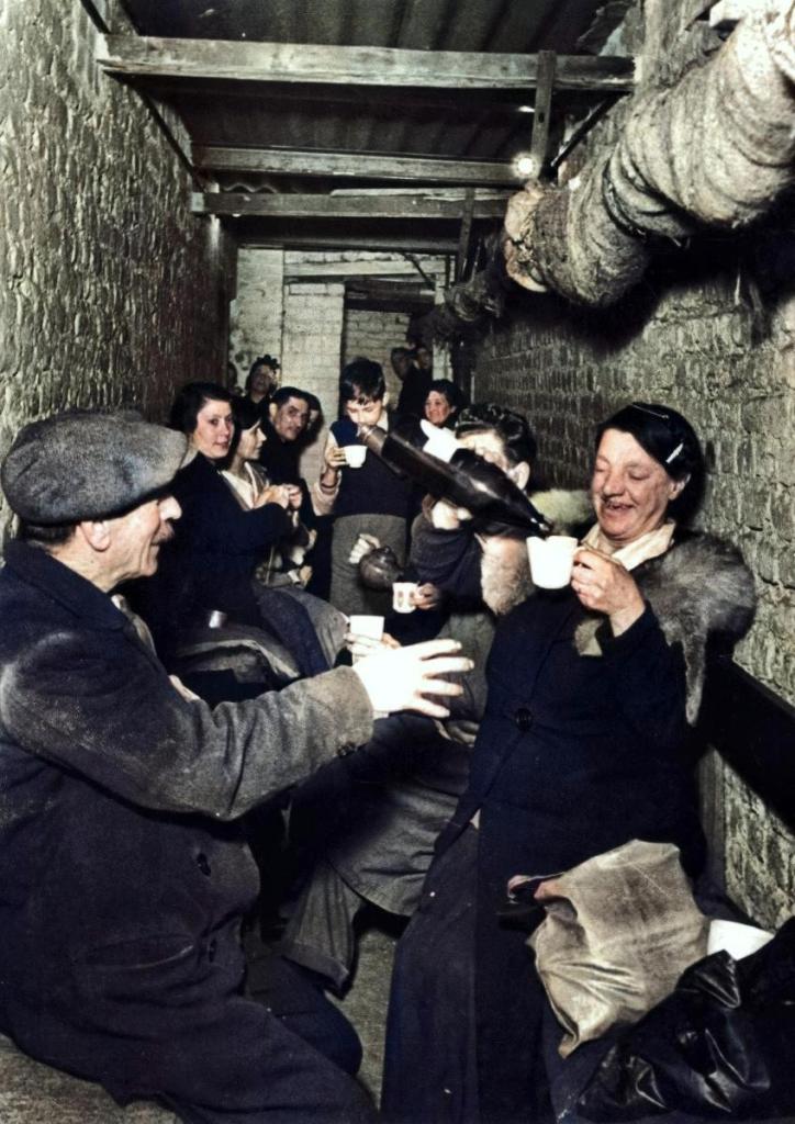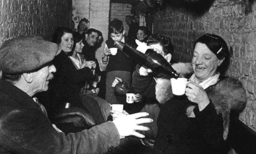 Islington residents displaying ‘Blitz spirit’, sharing drinks with neighbours while sheltering in an unidentified underground location.