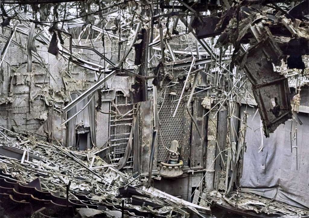 On 11/12 August 1944, a V-1 rocket (or ‘doodlebug’) smashed through the roof of Holloway’s 3,003-seat Gaumont Cinema. The photograph shows extensive damage to its auditorium.