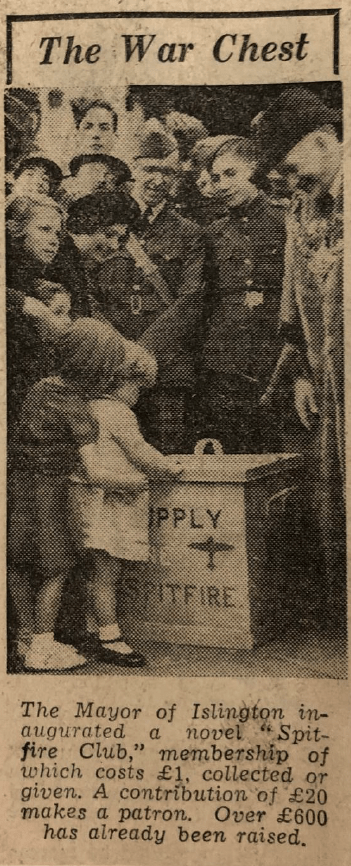 The slogan of the Spitfire Club was ‘each bob you pay keeps the bomber away.’ Cheques could be made payable to the Mayor of Islington’s Spitfire Club and by 13th August the Club had received nearly £150. The appeal had been going for less than a week.