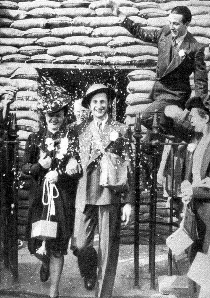 In the first ‘sandbag wedding’ of 1939, 20-year-old Corporal Charles White of the 1st City of London Regiment leaves Islington Register Office with his bride, 18-year-old Harriet Nock. The happy couple obtained special permission to get married and enjoy a summer wedding. Notice how the entrance to the building is covered in protective sandbags, by then a familiar sight.