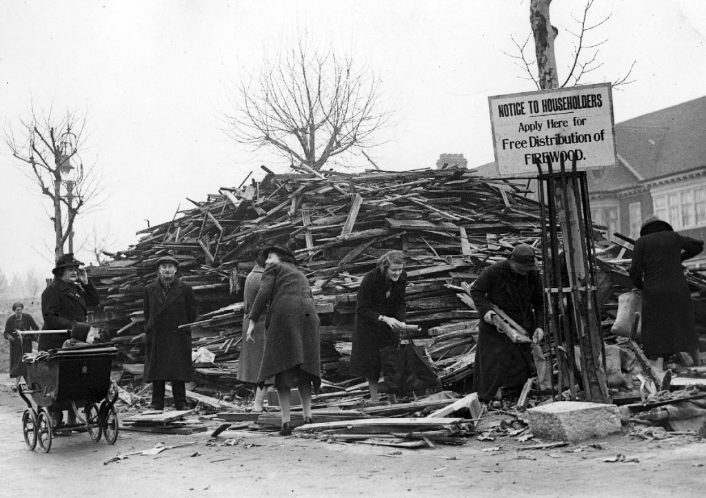 Islington residents gather free firewood from the pile of debris collected from destroyed buildings. While brick, stone and some other materials were salvaged for reuse following bomb damage to buildings, timber was available to collect as an alternative fuel to coal.