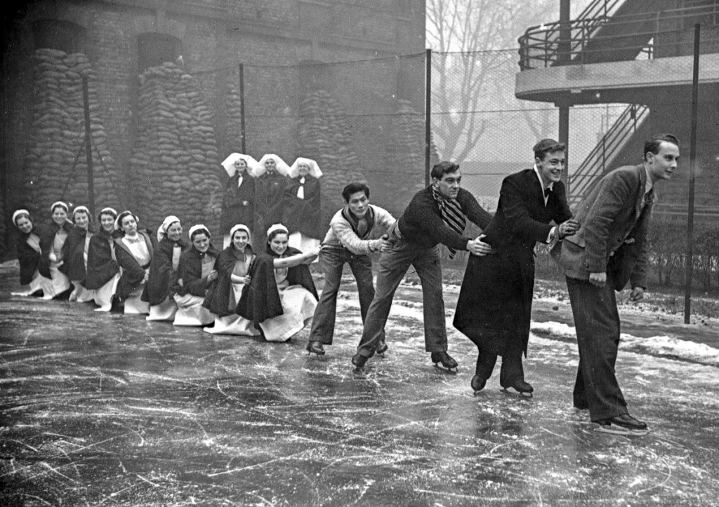 The caption on the reverse of the original photograph reads, “Off-duty fun. Picture shows nurses of the London Fever Hospital, Liverpool Road, and St Bart’s students enjoying themselves during their off-duty period.” They were enjoying ‘frozen frolics’ on the hospital’s tennis court on New Year’s Day 1940.