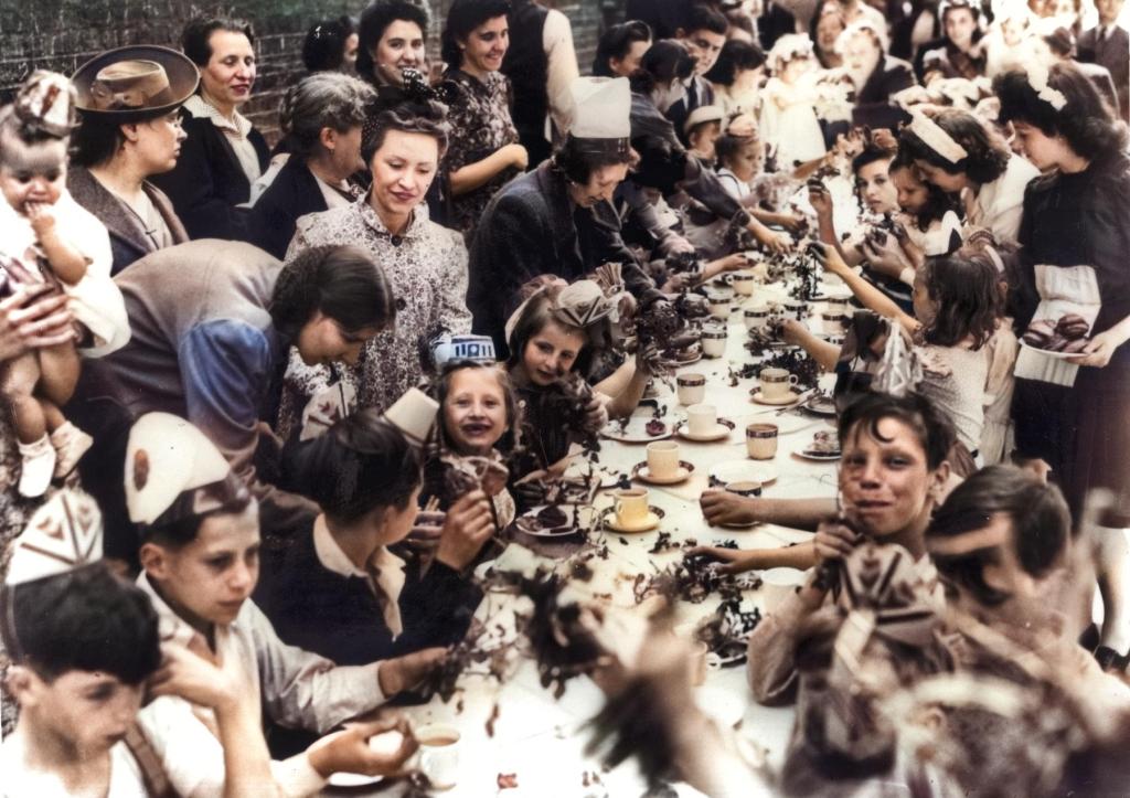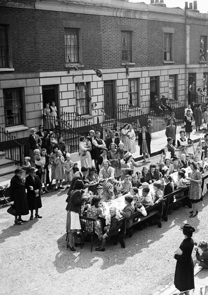Revellers wore their best clothes or fancy dress. They made paper hats and sang and danced in the streets. Material for flags and bunting was de-rationed for the occasion. It was the first festive occasion that many children would have experienced.