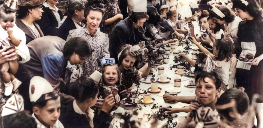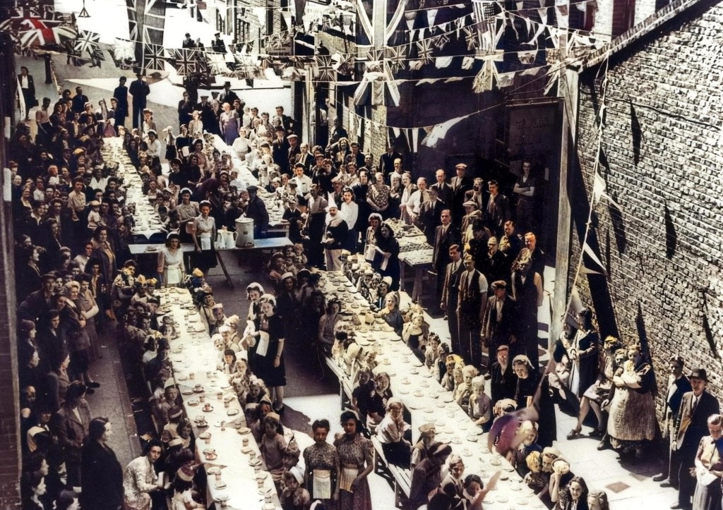 In Islington and Finsbury, the streets were crowded with tables, likely stacked with spam and dripping sandwiches, eggless fruitcake and Lord Woolton pie (a pastry dish of vegetables). Some food and materials, such as those for buntings, were derationed temporarily to help residents mark the occasion. Special treats, such as sweets, buns, jelly and “lashings of ice cream,” were also enjoyed at the celebrations. Local businesses and benefactors gave donations of food and money to supplement the £2,000 (approximately one farthing per person) provided by the council for the occasion.