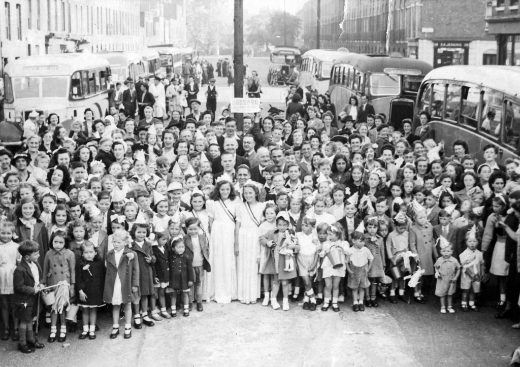 Some celebrations started as soon as the news of the end of the war in Europe was announced on 7 May 1945. Some were postponed until all evacuees returned home so that entire families and communities could celebrate together, such as here in Athelstane Road, Finsbury Park. Events included street parties, parades and bonfires.