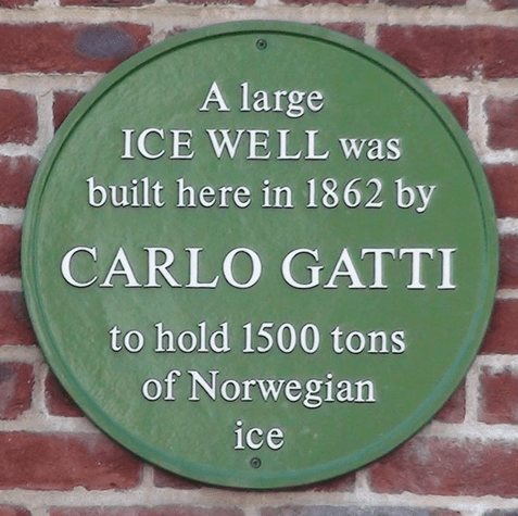 Gatti started importing ice from Norway around 1857. The ice was shipped to London, brought up the Thames and eventually transferred onto barges in Limehouse. The barges took the ice up the Regent’s Canal to Gatti’s two newly opened ice warehouses. One of these was located on Battlebridge Basin (and now houses the London Canal Museum) and the other on Caledonian Road, near Cally Park. Its location is marked by a green plaque.