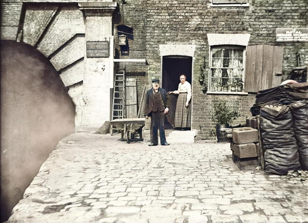 At the eastern portal of Islington Tunnel stood the two roomed cottage of the Islington tunnel keeper. Built into the tunnel wall, the cottage provided a home for the tunnel keeper, where they could easily marshal the barges and blow a copper horn to signal when boats were coming through. The photo on the left from 1905 is thought to be of Mary Rockingham, who took over the job of tunnel keeper in 1902 from her husband. Later in the 20th Century, the tunnel keeper’s two room cottage disappeared, as seen in the image on the right.