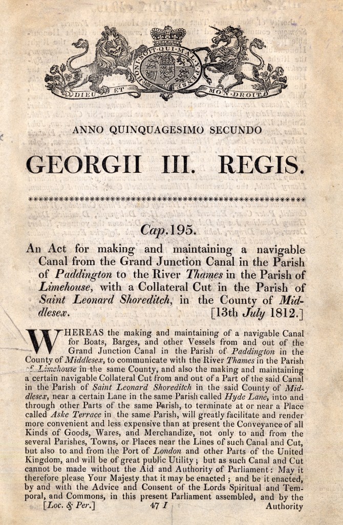 Since 1802, Thomas Homer, a businessman and merchant, had been promoting the idea for a ‘London Canal’ joining the Paddington section of the Grand Junction Canal with the River Thames at Limehouse. In 1811 he contacted Nash and Morgan who reviewed the route. This led to Nash becoming a driving force in the promotion of the canal, using his association with the Prince Regent (later George IV) to help influence the project. Morgan drew up plans for the canal which, with the consent of the Prince Regent, became the Regent’s Canal. The Regent’s Canal Act, based upon these plans, was passed in Parliament in July 1812.