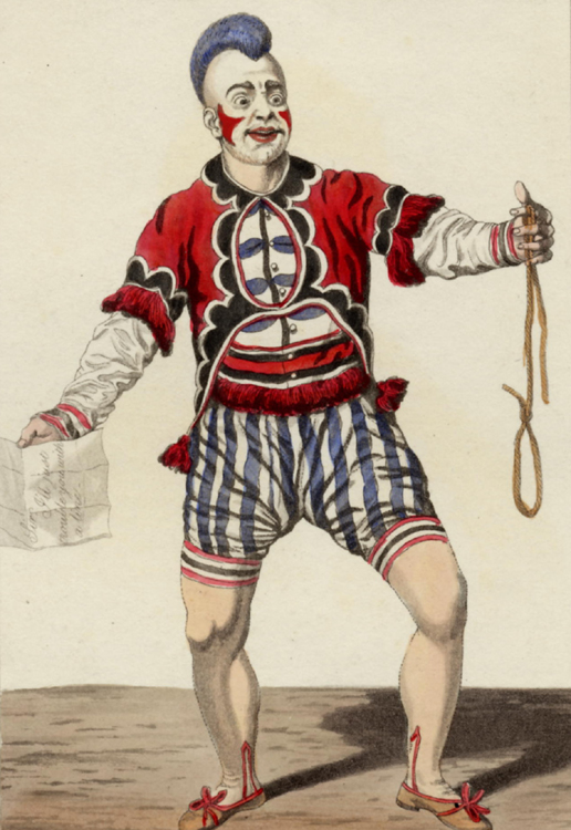 Joseph Grimaldi (1778-1837) was an actor, pantomimist and clown. His style of clowning, including face make-up and colourful dress, is now what we associate with the image of a clown. He performed in many pantomimes all year round but one of his greatest successes was his performance in Harlequin and Mother Goose (or The Golden Egg), a Christmas pantomime written by Thomas Dibdin, brother of Charles Dibdin, and performed at the Theatre Royal (later Royal Opera House), Covent Garden, in 1806.
