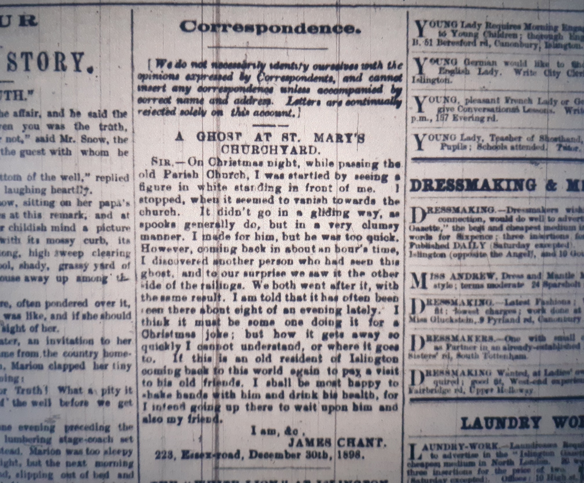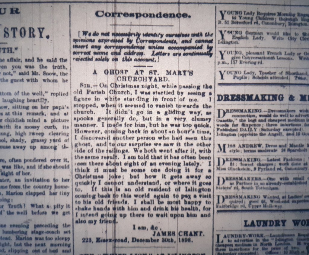 On Christmas night 1898 the Islingtonian James Chant claimed to have encountered a figure in white at St Mary’s churchyard. He, along with another person who he bumped into who had also come across the ghost, attempted to chase the figure to no avail. However, not disheartened, he declared he had every intention of returning to resume the hunt. His letter, sent to the Islington Gazette on 30th December 1898, was published in the daily edition on the 3rd January 1899.