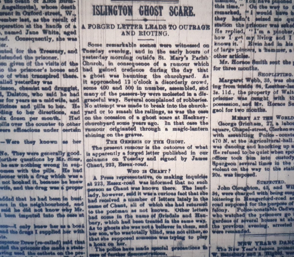 The ghost sighting at St Mary’s caused a bit of a stir with someone writing to the Islington Gazette to assert that the ghost sighting was merely a prank played by someone running around the churchyard wearing white. The ghost sighting went on to become even more controversial as the story began to circulate and the Islington Gazette reported that a “disorderly crowd” began to gather on the Tuesday evening into the early hours of the following morning outside St Mary’s Parish Church. However, when a reporter attempted to find the originator of the ghost sighting at the given address, there appeared to be no one by the name of James Chant in residence.