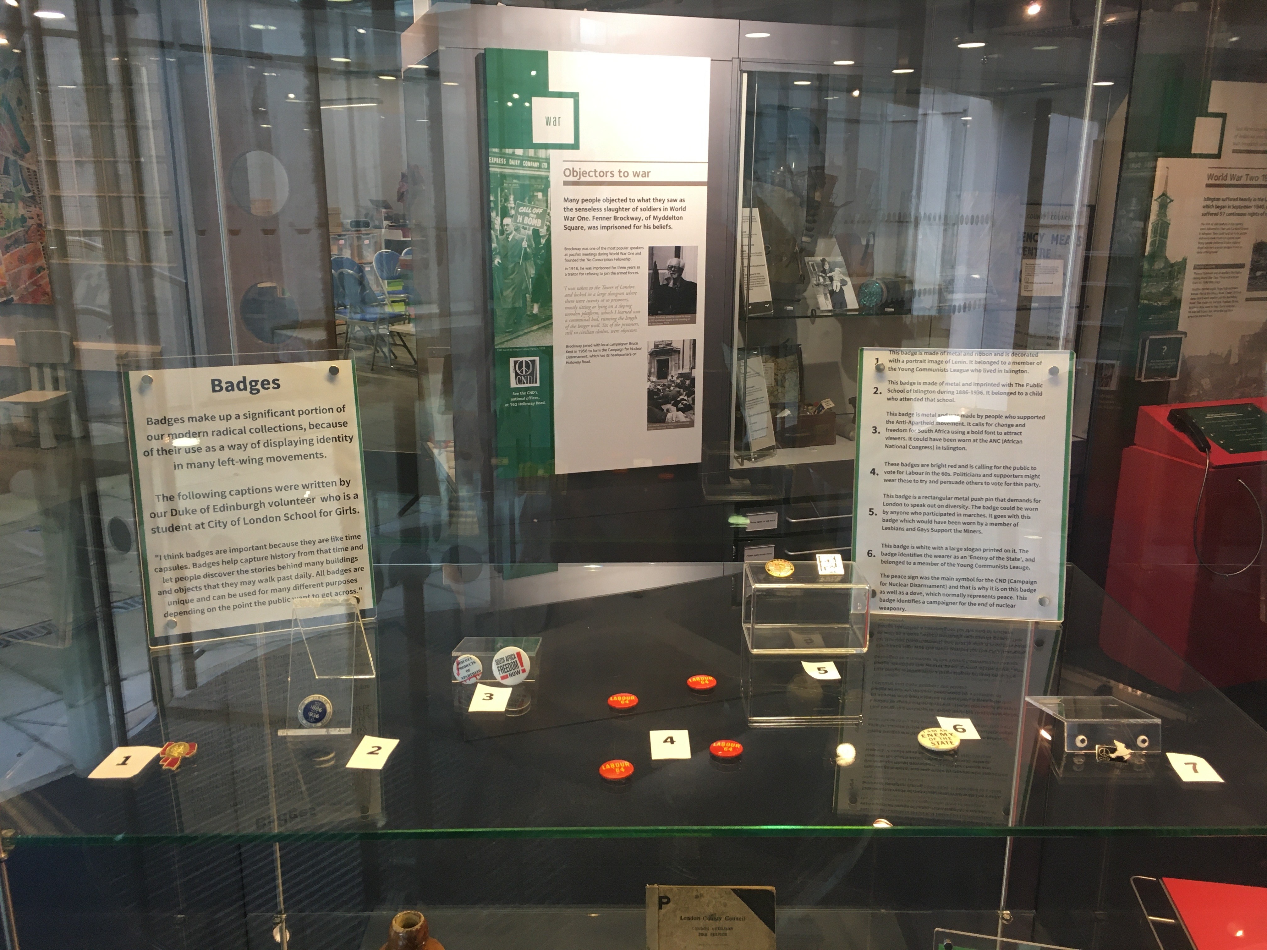- I first learnt how to handle objects in the collection and then I began a project looking into different badges in the collection and what they were trying to promote. Using this information, I created a display case with badges of my choosing. I also wrote the captions for them and realised the amount of hard work that went into designing a display case to maximise interest and enjoyment.